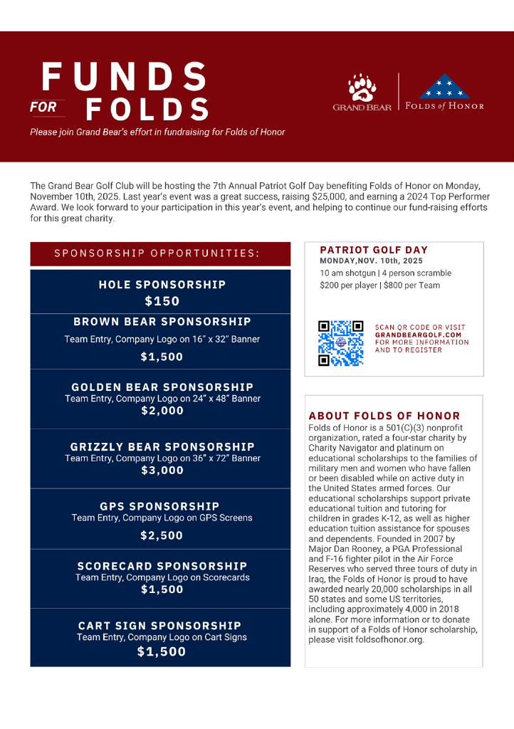 Join us for our 7th annual Patriot Golf Day scramble tournament benefiting Folds of Honor charity, on Monday, November 10th, 2025. It is a privilege to be able to host this tournament in support of Folds of Honor, who provides educational scholarships to the families of military men and women who have fallen or been disabled while on active duty in the United States armed forces. We look forward to another successful tournament this year and hope to see you there!